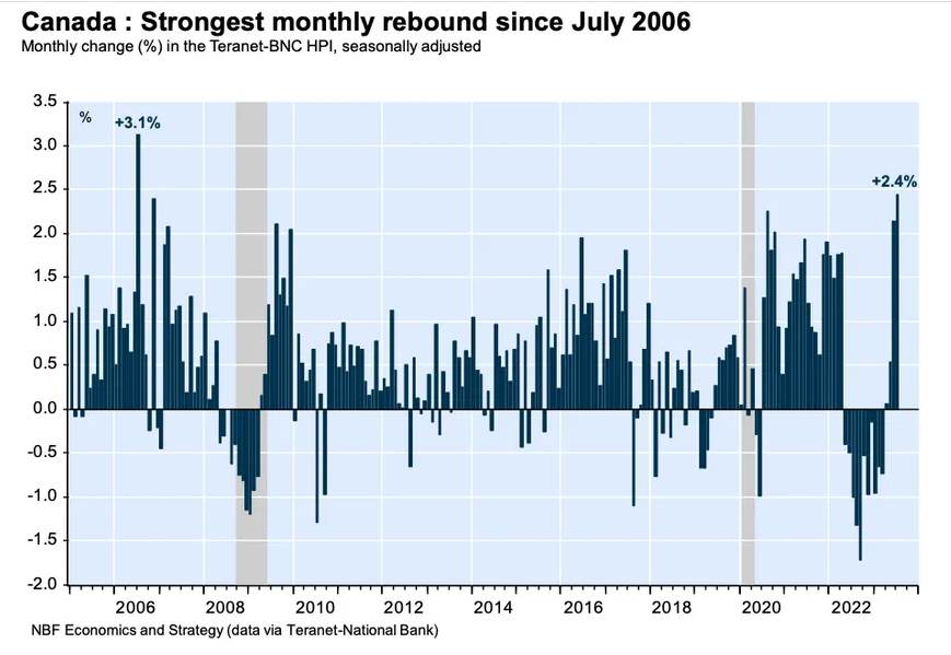 最新的 Teranet-National Bank 综合房价指数, 上个月累计环比上涨 1.8% (季节性调整前),标志着连续第五个月增长。调整季节性影响后,该指数 7 月份连续第四个月上涨,涨幅为 2.4%。
