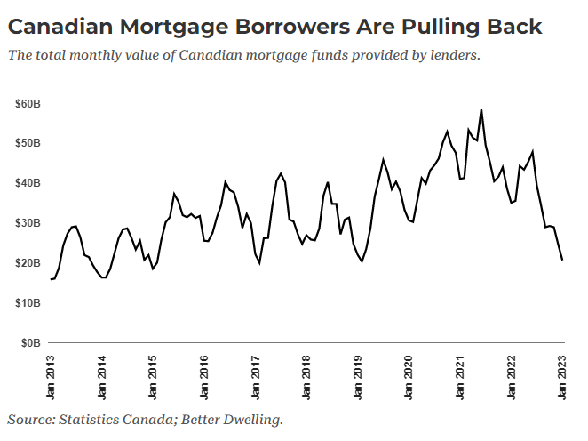 由于较高的利率影响了杠杆率,加拿大的抵押贷款发放异常缓慢。1 月份新抵押贷款基金的价值下降 16.1%(40 亿加币)至 207 亿。