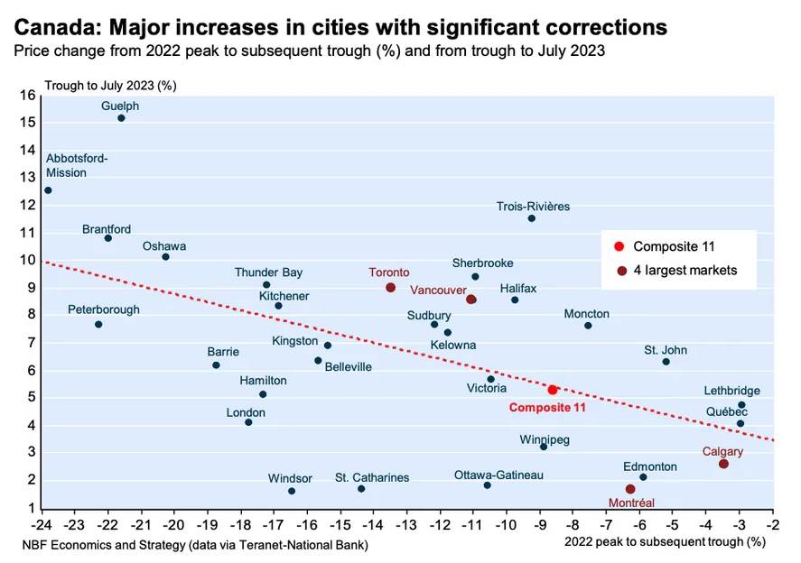 King 写道:“自 2022 年 4 月达到峰值以来,综合指数累计下跌 8.6%,但最近的上涨已经抵消了部分调整,目前仅为 3.8%。有趣的是,最近价格上涨幅度最大的城市之前出现了最大的调整。”